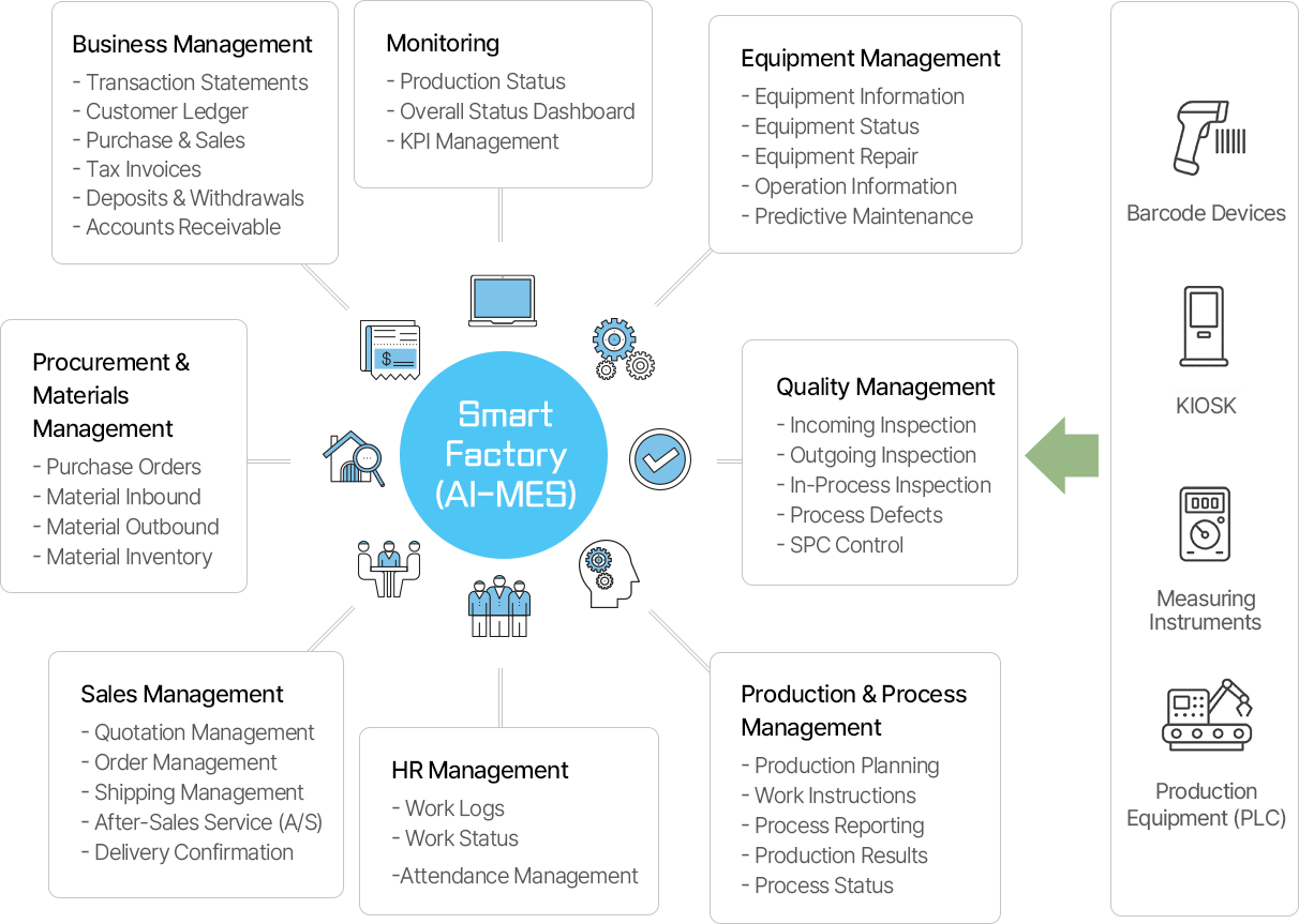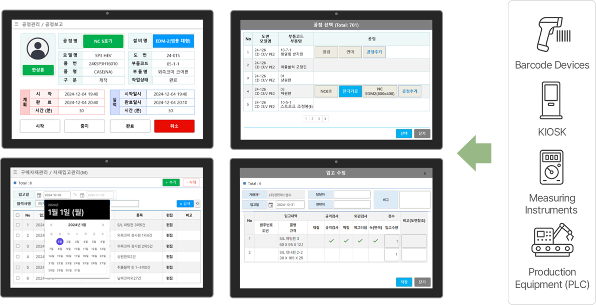 With MES (Manufacturing Execution System) and POP (Production Operation Point) at the core, we integrate the entire production process—from planning, processes, quality, equipment, and materials to business and operational management.
