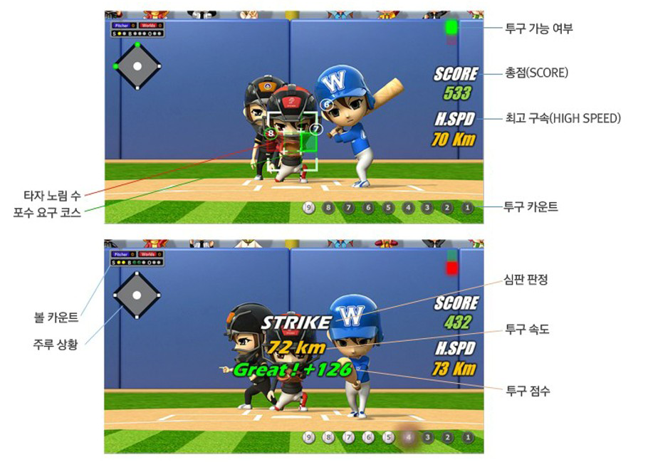 총 9개의 공을 과녁(포수가 요구하는 위치)에 던져 높은 점수를 내는 방식